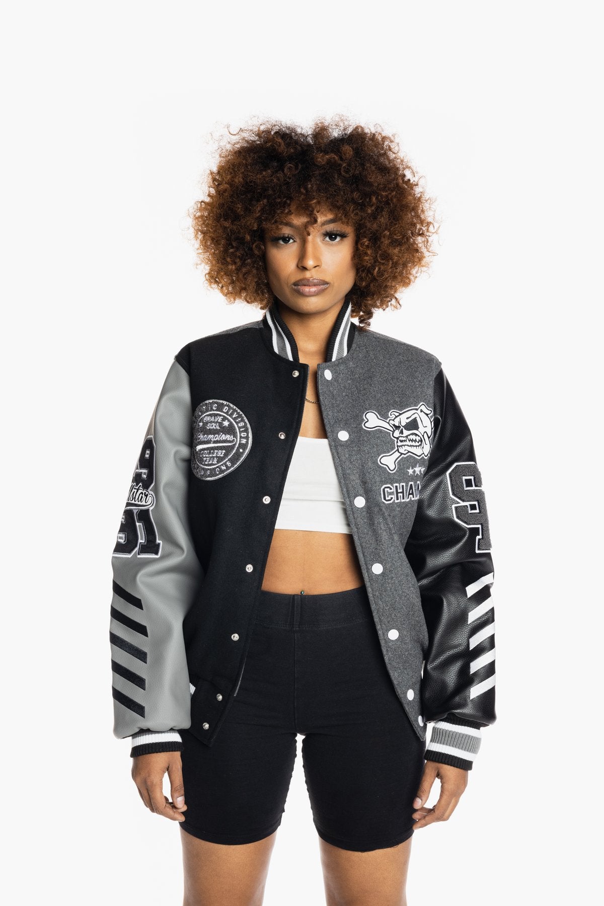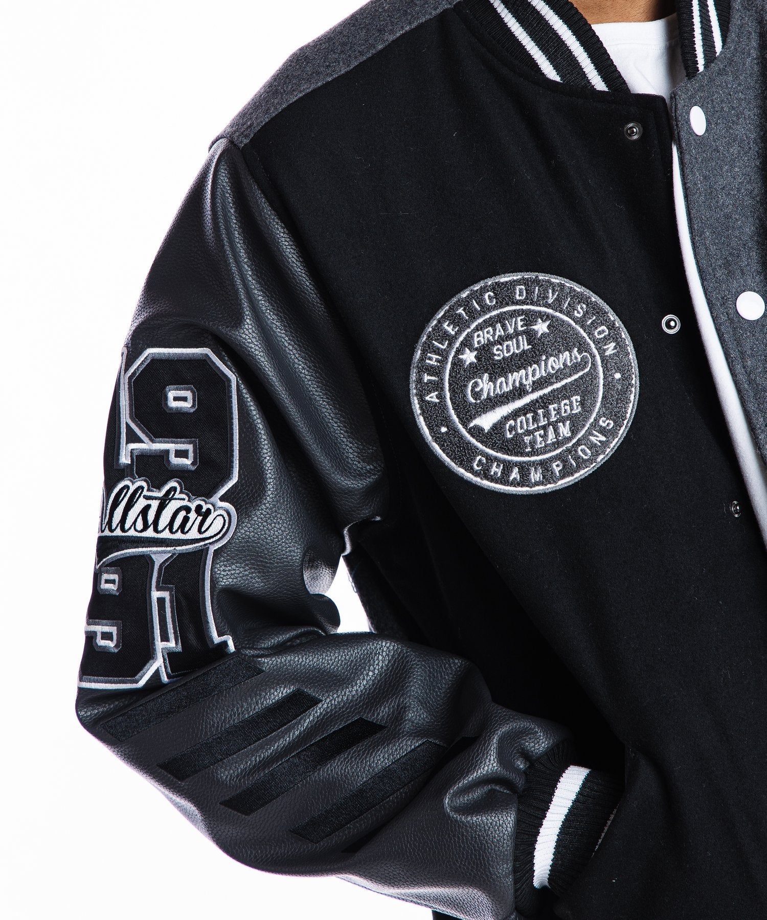SMOKE RISE EMBROIDERY FASHION MELTON VARSITY JACKET (GREY)