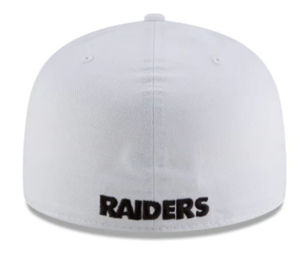 The Oakland Raiders White 59FIFTY Fitted features an allover white fabrication with an embroidered Raiders logo at the front panels and an embroidered team script at the rear.