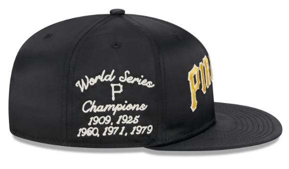 The Pittsburgh Pirates Satin Script 9FIFTY Snapback features an embroidered Pirates wordmark at the front panels with a World Series Championships script at the right-wear side. Additional details include a satin crown and visor, a gray undervisor, and a snapback closure at the rear.