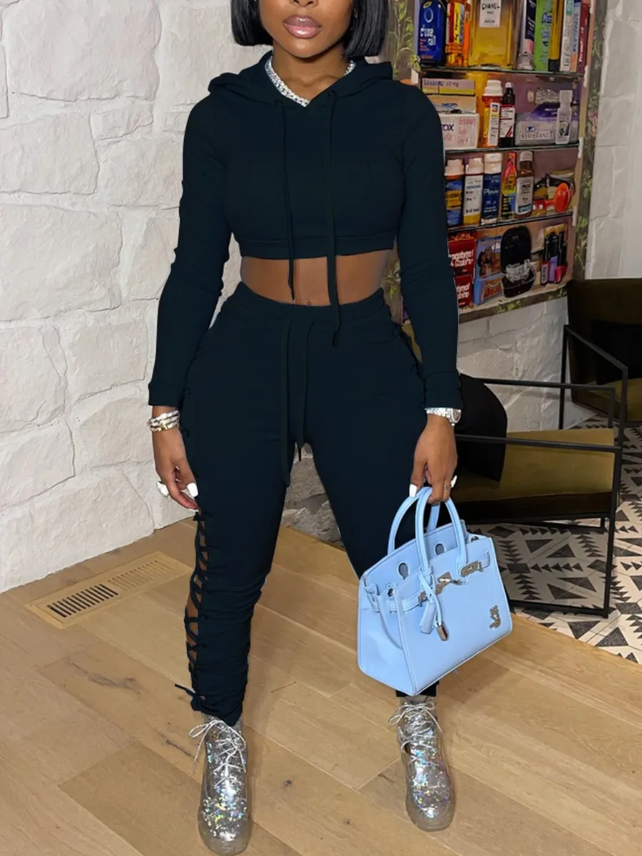 Women's Hollow Out Hoodie Crop w/ Jogger Set (Black) IN STORE NOW !